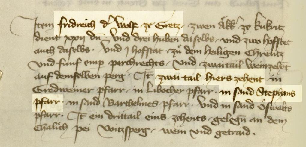 1373 findet sich dann die erste urkundliche Erwähnung im Zehentverzeichnis: „in sand Stephans Pfarr“ (hier fällt auf, dass Sankt Stefan als Pfarre bezeichnet wird). P. C. Brandtner dazu genauer im Pfarrblatt 1990-3: “… im Seckauer Lehensbuch. Darin ist verzeichnet, wie im Jahre 1373 Fridrich der Wolf zu Graz … zwai Tail des Hierszehent … in sand Stephans Pfarr erhält.”
